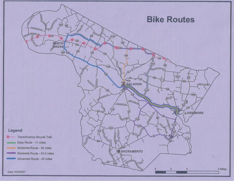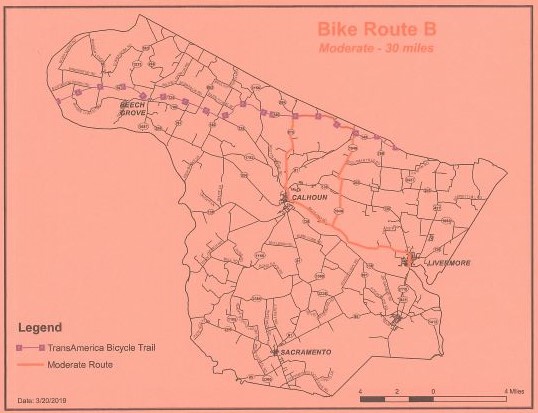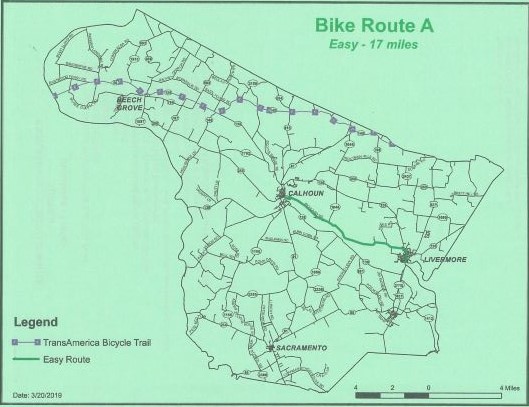 We have added another new bicycle route to those already listed here on this site. It is called "The Bridge Ride 'Purple' Bicycle Route D" which is classified as Moderate, 43.5 miles in length, and routes you from Livermore-Calhoun-Island and back to Livermore. Please see the map and biking directions below: