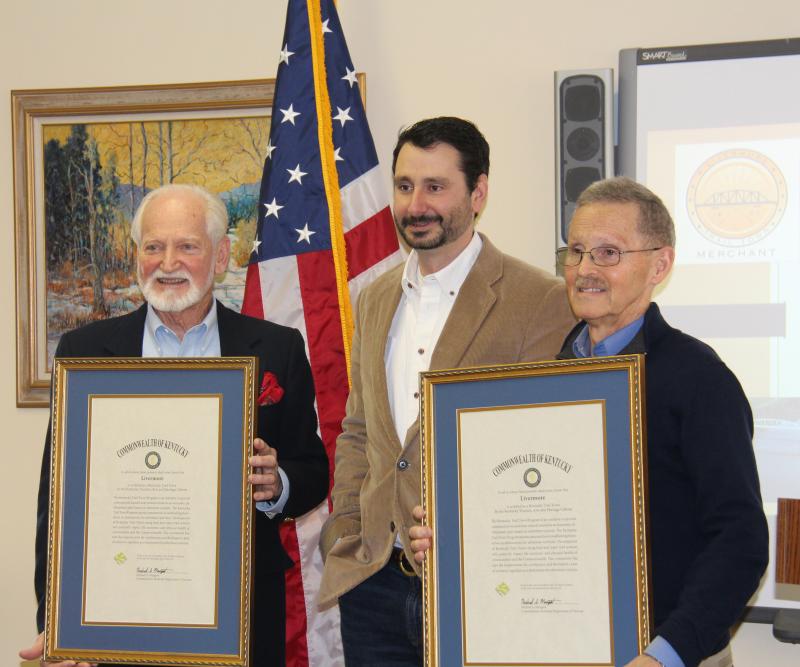John "Sonny" Renfrow, left and Dr. Ralph Thacker, far right, co-directors of Livermore's Kentucky Trail Town Task Force, stand with Seth Wheat, center, Director of Tourism Development for Kentucky Department of Tourism, after receiving Livermore's official certification of recognition of becoming the 25th Kentucky Trail Town on Friday, January 21, 2022 at McLean County Public Library.