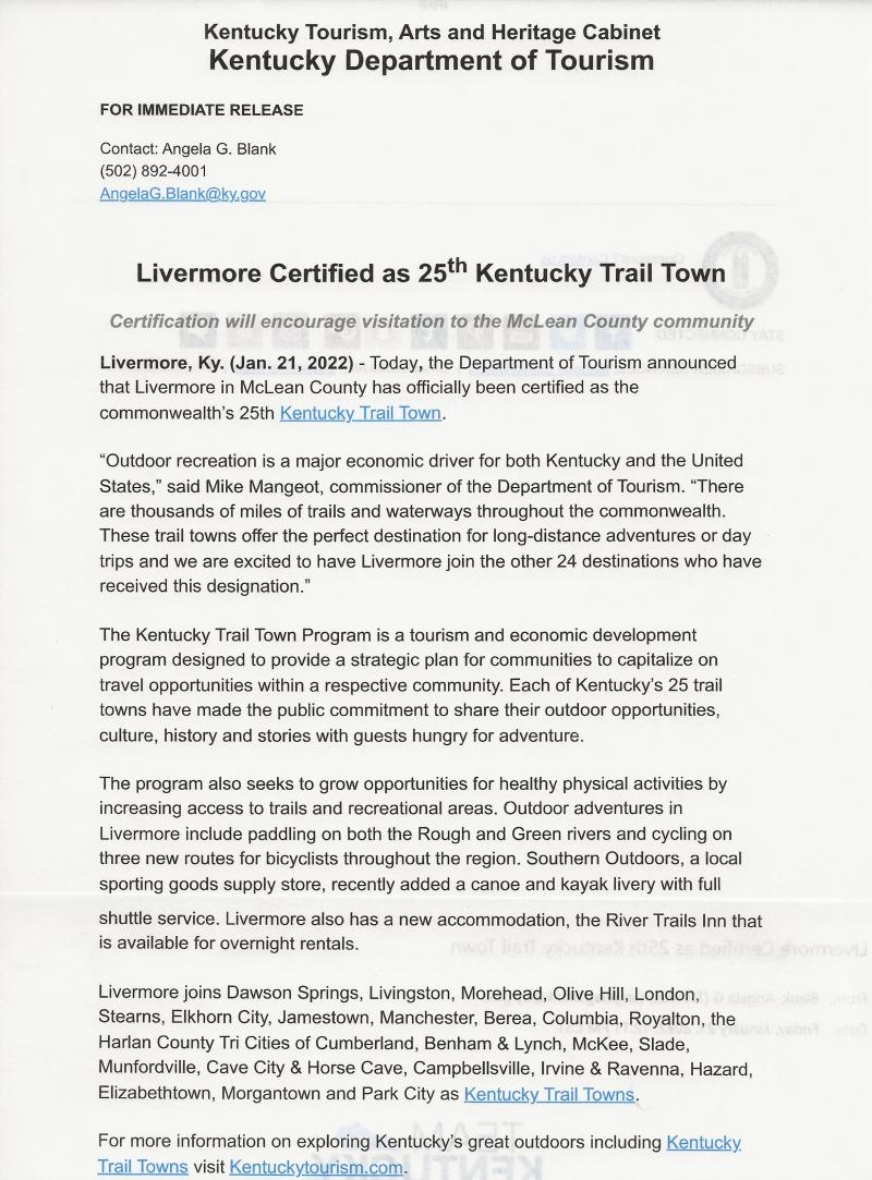 The Kentucky Department of Tourism announced that the City of Livermore, in McLean County, has officially been certified as the commonwealth's 25th Kentucky Trail Town! Great job Livermore Enhancement Foundation, the Trail Town Task Force and Supporters!